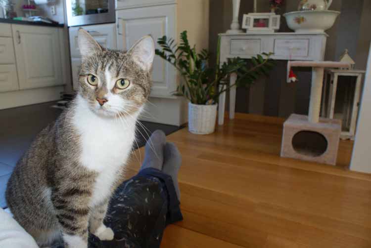 Als ze ook maar even de gelegenheid krijgt ligt ze om je nek gevouwen en zet ze haar spinmachine aan, ze loopt de hele dag met je mee, waar je ook maar naar toe gaat.