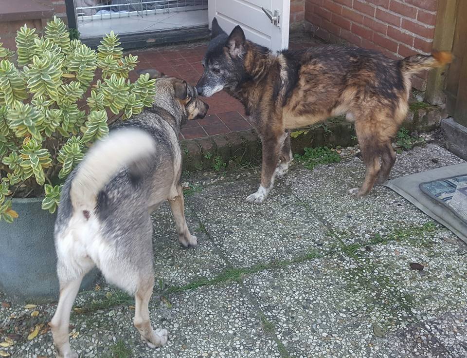 21 september heb ik Grace (heet nu Mila) opgehaald. We kwamen ong 22uur thuis ik heb mijn hond Max gelijk naar buiten gehaald waarop Mila begon te grommen ik heb ze niet aan elkaar laten ruiken en ben een rondje met ze gaan lopen. Toen we binnen kwamen heb ik Mila los gelaten, ze heeft eerst het huis onderzocht wat gedronken en even aan Max geroken en het was gelijk goed.