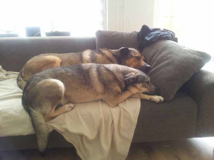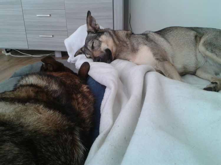 Het gaat nog steeds erg goed met Mila, helaas is Max in februari geopereerd aan een gescheurde kruisband. Mila was erg voorzichtig en lief met hem toen hij weer thuis kwam na de operatie maar wilde natuurlijk wel zoals gewoonlijk bij hem liggen wat mij hartkloppingen bezorgde aangezien ze steeds bij zijn zere poot neer plofte! Max kon een tijdje niet mee op de wandelingen dus ging ik alleen met Mila de eerste keer stond ze steeds achterom te kijken en naar mij van eh vrouwtje vergeet je niet iets.. maar samen lopen vond ze toch ook wel gezellig. Ik had een bench voor Max gekocht om rustig in te blijven als ik weg was aangezien hij zo min mogelijk moest bewegen (hij mocht er gewoon uit als ik er wel was) dat vond Mila eigenlijk ook wel een leuk plekje om in te liggen.
