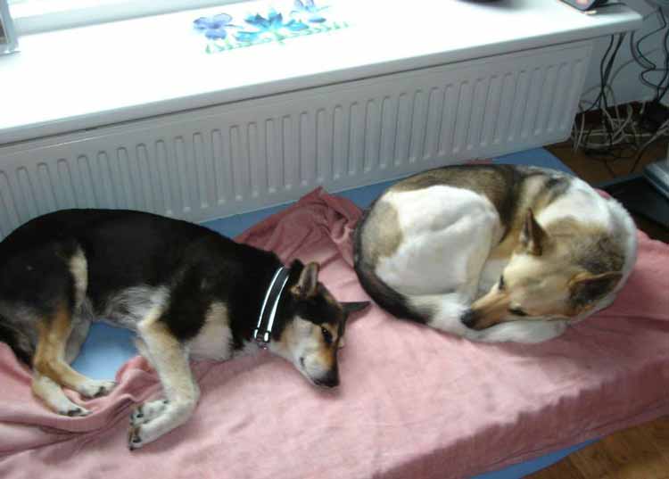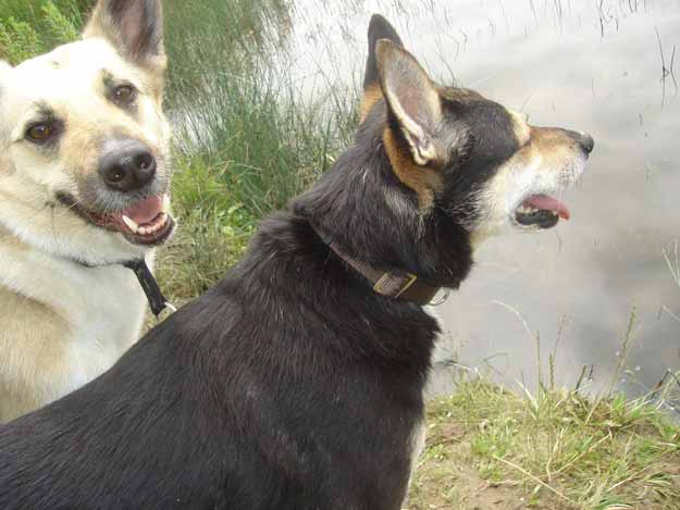 Samen jagen ze vogels weg. Alleen Cesar springt in de vaart om een eend achterna te zwemmen. Volgens mij wist hij zelf niet dat hij zo goed kon zwemmen. De eerste keer in het water schrok hij ervan en wilde hij er direct uit. Nu is hij niet meer te stoppen als hij een eend ziet (anders niet, want eigenlijk houdt hij verder niet van water – hij wilde er niet eens in staan met de warmte van de afgelopen weken.) Gelukkig luistert Cesar goed naar mij (behalve als hij al achter een eend aan zwemt – dan kan ik roepen wat ik wil maar ziet of hoort hij niets anders meer dan de eend). Thuis zijn het net twee katten: liggen het liefst te slapen, zijn dol op knuffelen en het allerdolst op eten.