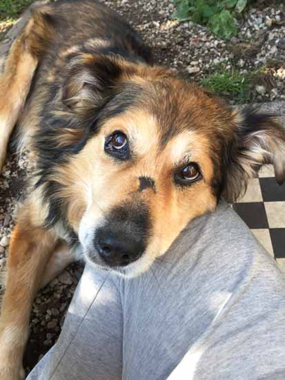 Wat zijn verleden is zullen we nooit weten. Hij heeft een bobbel op zijn neus die geen kwaad kan. Die is onderzocht door de dierenarts. Zijn linkeroog ‘hangt’ waardoor hij die melancholische (lieve) blik heeft.