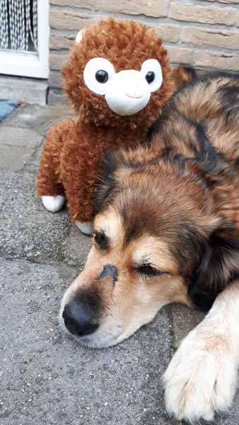 Mishka is nu drie weken bij ons en wat een gemakkelijke, loyale goedzak. Rustig wandelen, totaal zonder trekken, binnen bij de baas in de buurt liggen, rustig genieten van zijn eten. Dat is teddybeer Mishka.