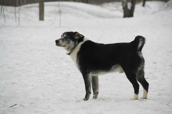 Sharik quietly walks on a leash. Does not pull. When he walks without a leash he listens well and return back in place. With other dogs behaves normally, with all the same, never seen any agression from him. With new dogs also behaves calmly and friendly. Does not play too much with others dogs (probably because of not young age? or no interest). In the shelter he eats dry food, but when volunteers come he accept with great pleasure smth more tasty (meat, dogs small food). He is good and adequate dog.